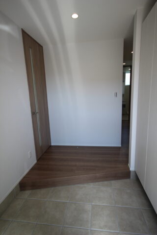 玄関の上がり框を斜めに施工し奥行きのある玄関に。