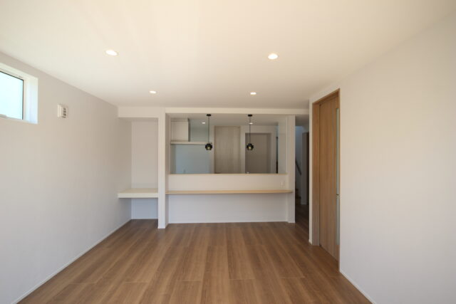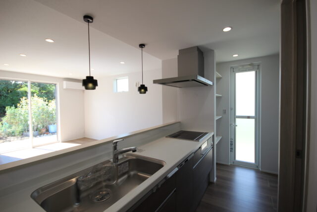 キッチン横には可動棚を配置し、調味料やサッと出したい物が出しやすい位置に。