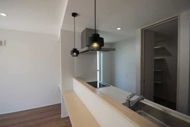 キッチンの奥に見える空間には、大容量のパントリーが。